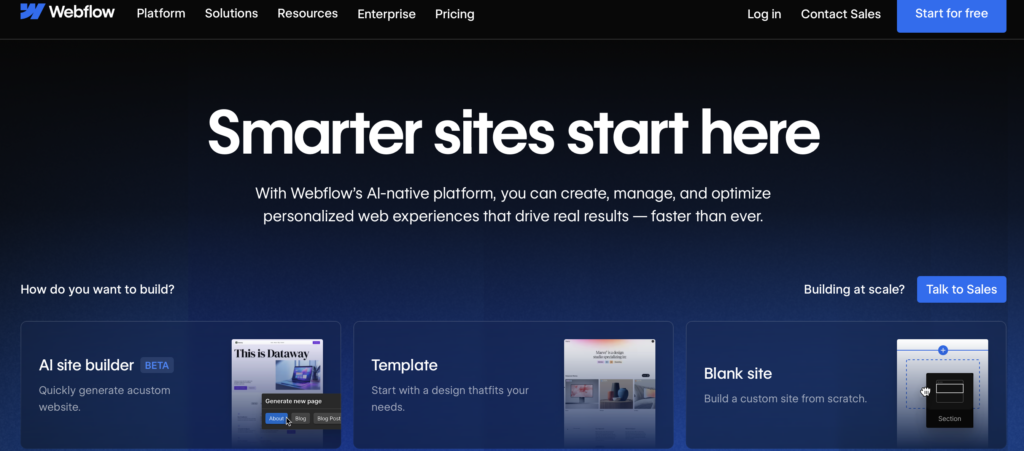 Description: Webflow is a visual web development platform that bridges the gap between design and code. It offers AI-assisted design features and allows you to build professional, responsive websites without writing code.