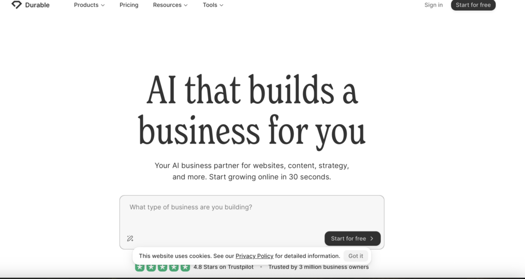 Description: Durable uses AI to build complete business websites in under 30 seconds. It’s designed for small business owners who need a quick online presence without technical knowledge.