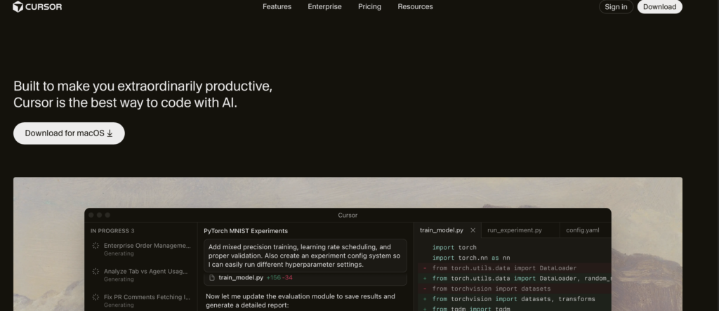 Description: Tabnine is an AI code completion tool that runs locally or in the cloud. It offers privacy-focused AI assistance that can be trained on your team’s codebase.