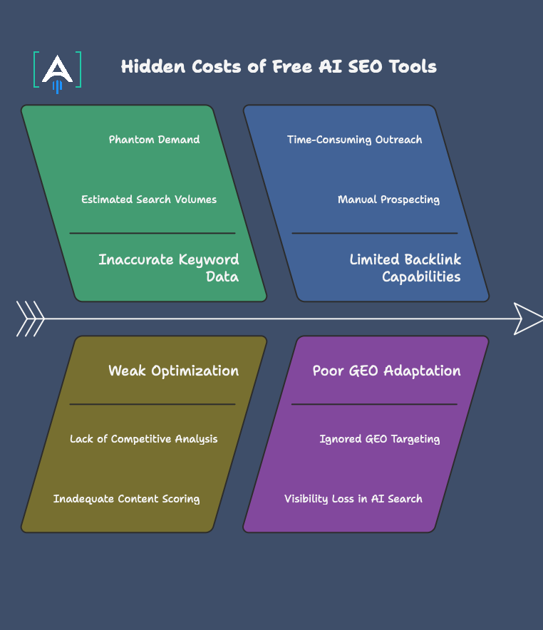 Free AI SEO tools appear cost-effective until you calculate what they actually cost in lost opportunities and wasted effort. These hidden expenses compound quickly.